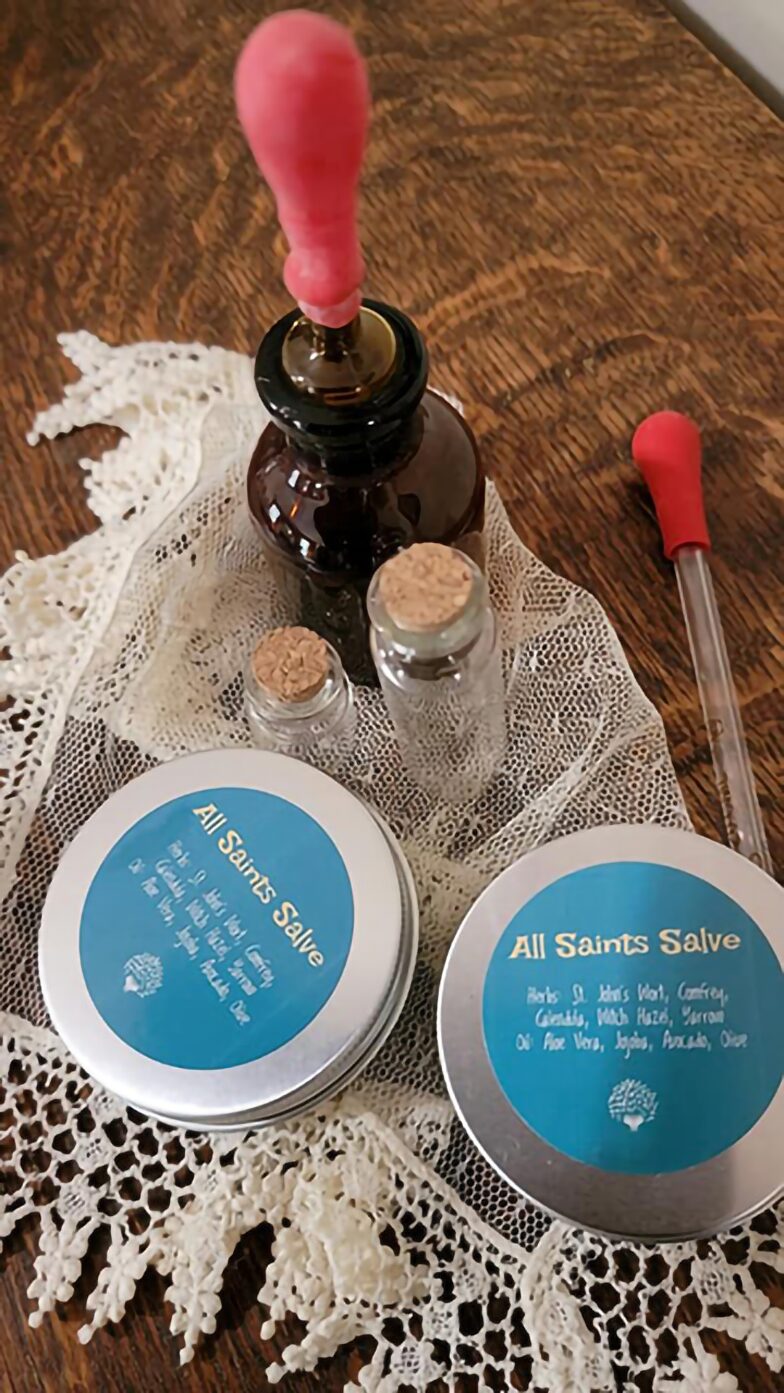All Saints Salve contains St. John’s Wort flowers and leaves, Comfrey leaves, Witch Hazel leaves, Calendula petals, and Yarrow.