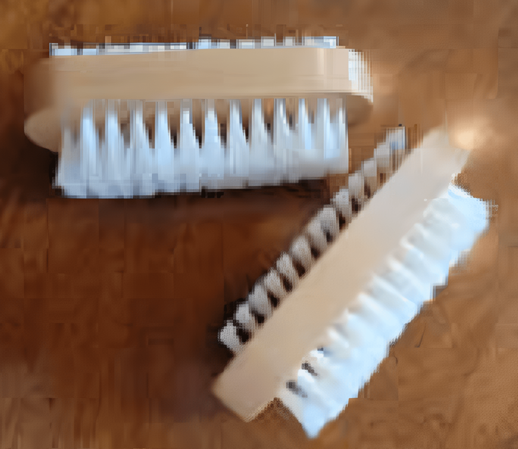 Nail Brush, with gentle bristles on both sides. One side has a single row of slanted bristles for getting under your nails, and the other is a full brush for hands and feet.