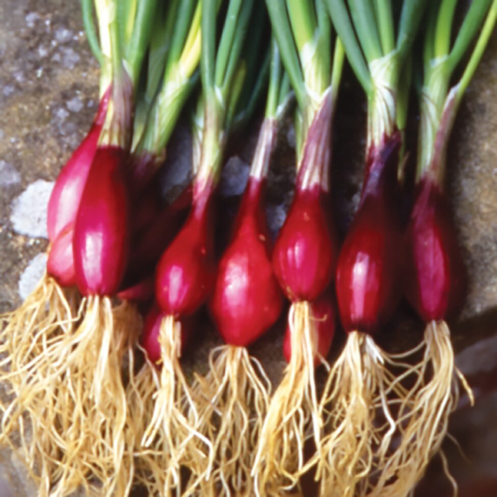 These flavorful specialty onions mature early and hold well. These little scallions/onions are a glossy rich burgundy, transforming to a nice pastel pink when cooked or pickled. They take half as long as storage onions to reach eating size. In England, they are called the Salad Onion and it is ideal for growing in a container.